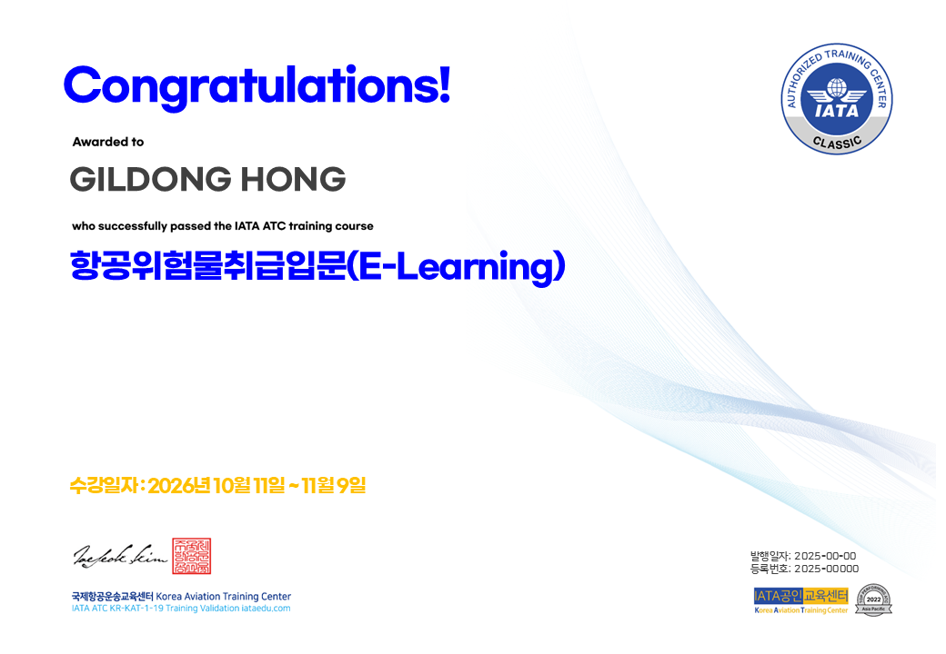 | 제목 | IATA공인교육센터 스터디에어 교육이수증 샘플(Sample) | ||